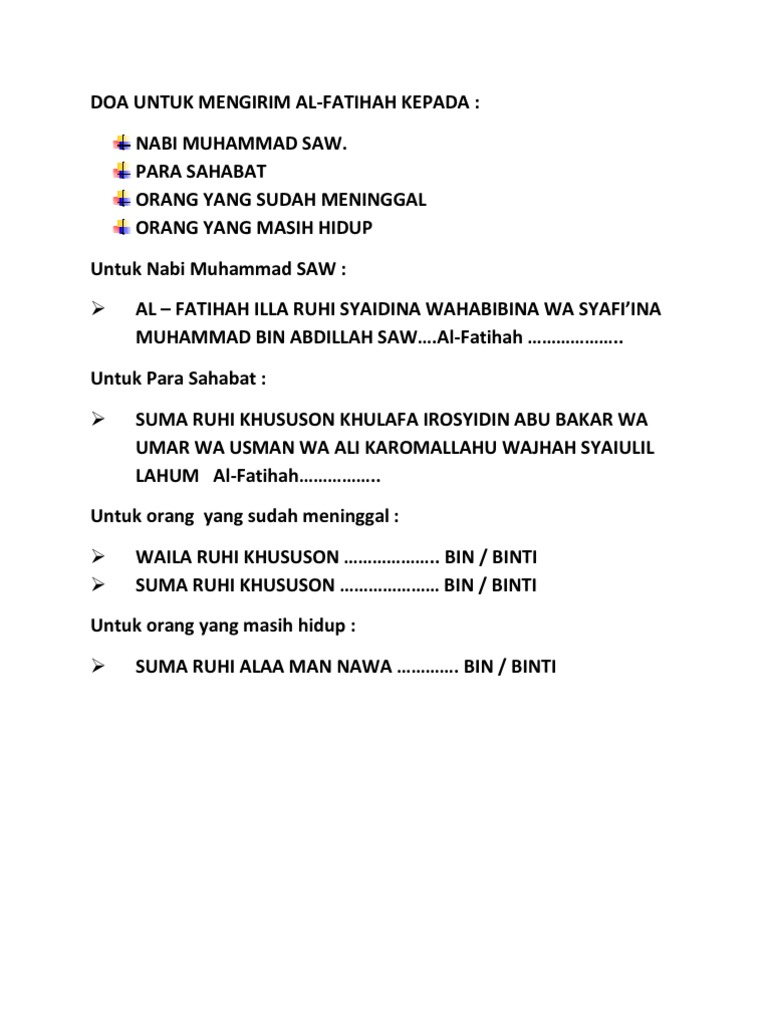 Khususon ila ruhi wajasadi. Wa ila jamii arwahi ahlil quburi minal muslimina wal muslimat wal muminina wal muminat wa khushushon ila ruhiarwahi abiy ruhiarwahi ummiy alfatihah ruhi jika masih hidup arwahi jika sudah meninggal dunia 9. Wa khushushon ila ruhi wa jasadi shohibul hajat. Afatihah khususon ila rohati al fatihah ila ruhi amalan seyh abil abas ibnu mulkhan antara ila ruhi dan ila hadroti Apa arti dari ayat summa apa arti illa ruhi wal jasadi apa arti wa jasadi apa artinya hususon suma ilaruhi pil jasadi Apa artinya ila arwahi apa artinya ila ruhi jasadi Apa artinya wailah arwahi apa artinya webil khus Apa bedanya doa khususon ila hadarathin khususon.